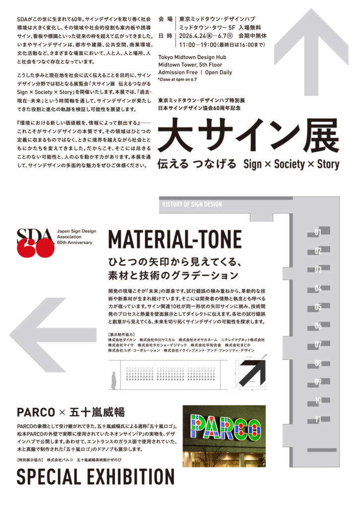 こうした変遷を社会に広く伝えることを目的に、そして60周年を迎えた今こそがその機であるととらえ、私たちはサインデザイン分野では初となる展覧会「大サイン展/伝えるつながる Sign × Society × Story」を開催いたします。会場は東京ミッドタウン・デザインハブ、会期は2026年4月、約1ヶ月間を予定しています。